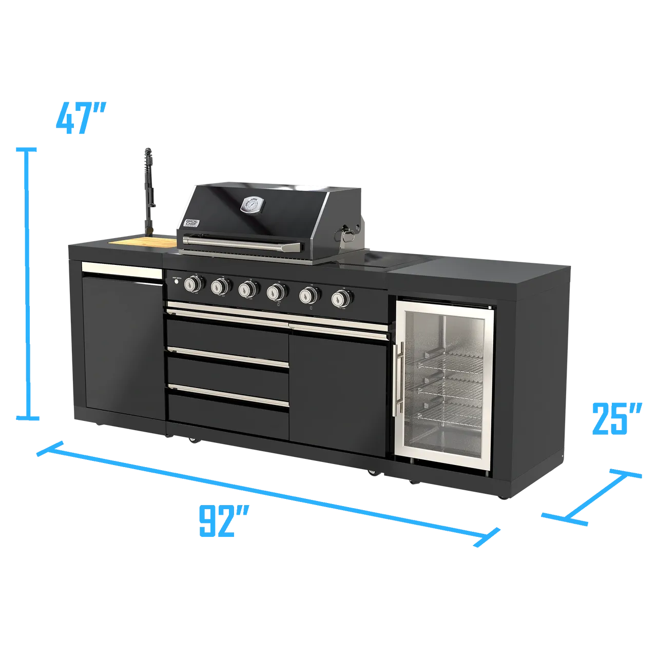 Full Outdoor Kitchen Amenities – Built-in sink, refrigerator, storage, and included accessories (model dependent).
